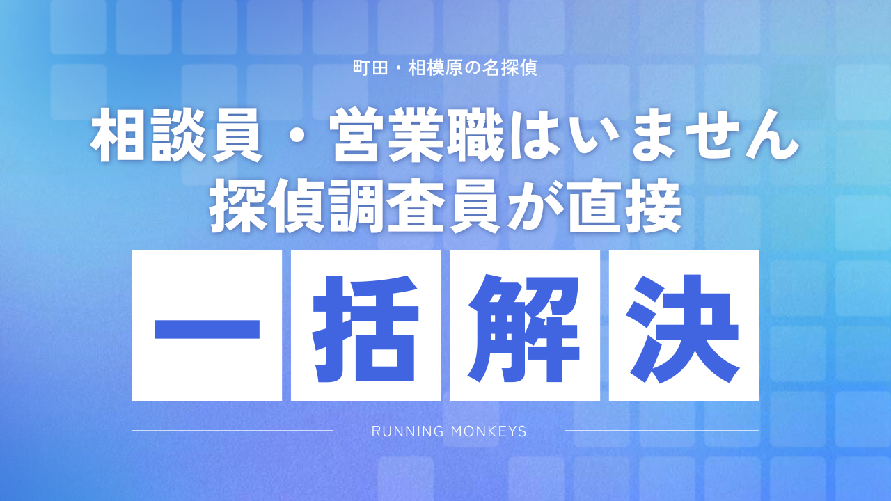 「町田・相模原の名探偵|ランニングモンキーズ」は、より安価でより高精度の調査結果を追い求めてます!大手探偵社では実現困難、小規模だからこそ実現可能な調査料金・寄り添う心を忘れずに邁進してまいります。些細なことでもどうぞお気軽にお問合せください。